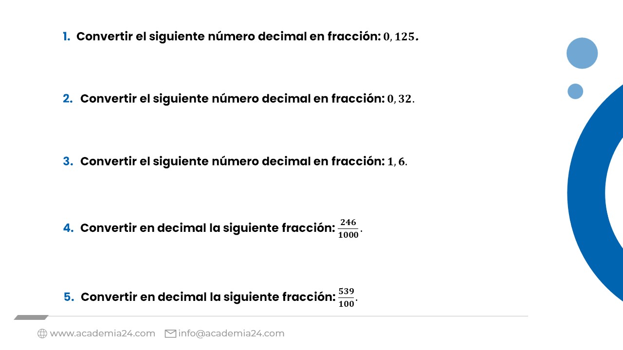 Conversión de números decimales hasta las milésimas en fracciones y viceversa con denominadores formados por la unidad seguida de ceros