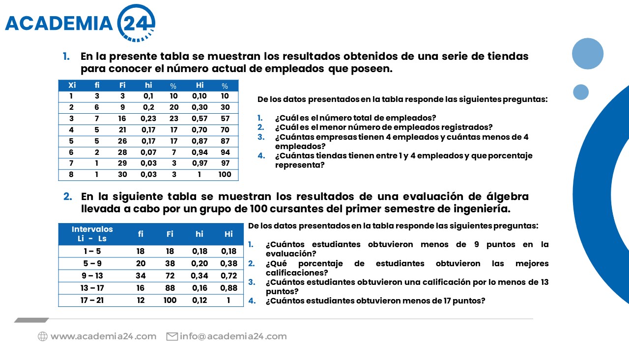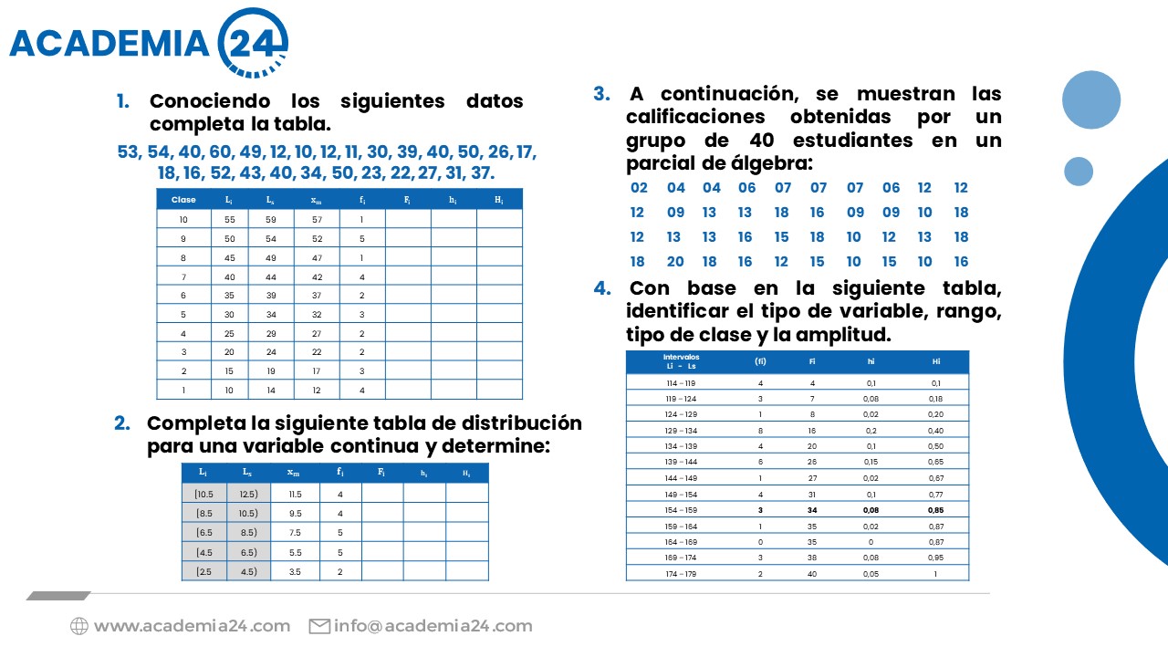 Construcción de tablas de distribución de frecuencia para datos agrupados o con intervalos: rango, intervalo de clase, tamaño o amplitud, límites de clase, marcas de clase, frecuencia absoluta, relativa, y sus acumulados